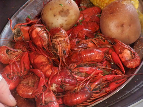 This was not our lunch, obviously. But the folks on the next table over enjoyed this colorful plate of crawfish. Connie calls ’em river bugs. “Ain’t eatin’ no bug.” Actually, they taste like lobster. Honest!