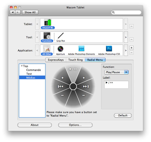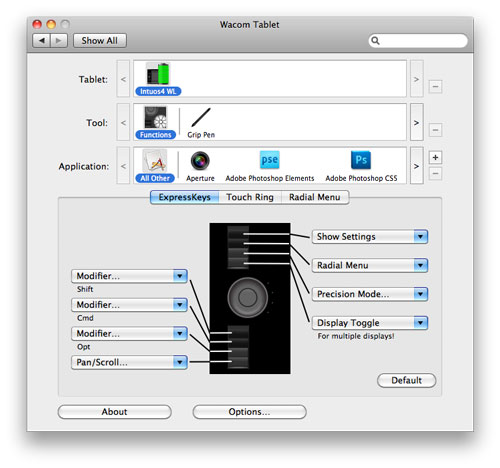 The good thing is all that can be triggered by a keyboard shortcut can be customized to a tablet function. And considering that all professional applications, such as Photoshop CS5, Aperture, or LightRoom, let you customize your keyboard shortcuts, that means you can do most of the work without having to touch the keyboard. But this requires a little work from the end user. In my case, I’m trying to make the most of the Radial Menu. For example, by customizing the Radial Menu for Aperture, and putting it on one of the Express Keys, I am able to use the loupe, change my views, or select the adjustment tabs without having to hit the keyboard.