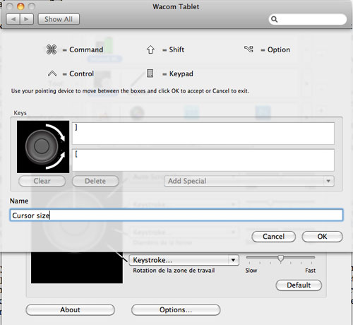 One of the advantages of a tool like the Wacom Intuos 4 series is the fact that it can be customized on a per user basis. Even more, it can be customized to different sets of functions on an application basis. In the System Preferences panel for the Wacom Tablet, in the Application section, hit the + button and select the application you want to customize. If the application you want is launched, you can select it from there, or use the Browse button to select an unopened application. Then in the Application section, select it and start customizing it to your need. Every application that is not defined there will use the default set of functions. In the Tool section, you can customize either the tablet buttons, the pen, or any other additional accessories you have on a per application basis.