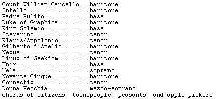 Gilberto d’Amelio reluctantly asks Steverino to return and to share in governing the duchy. He is desperate for help to increase the duchy’s capacity to grow apples since it is their only means of revenue. He sings “An apple a day doesn’t cut it.” Steverino accepts in his usual confrontational fashion:”Who are you?” He improves apple production fivefold by clever use of sweet talk to the labourers and a heavy dose of cow manure to the trees. Occasionally, he confuses the two as he explains: “Any way you look at it, it’s still crap“. He gains the help of Nexus, leader of UAPC, the United Apple Pickers of Cupertino. He also receives free support from Linux of Geekdom and his father, Unix, who rule the adjacent duchy. Gilberto, Steverino, Nexus, Linux, and Unix join in a joyous chorus of “We’re forever growing apples.”