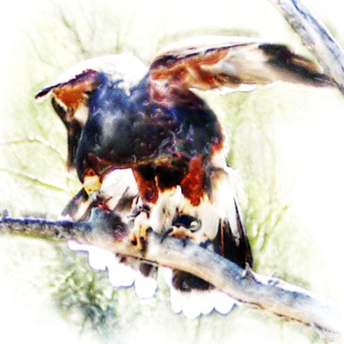 I decided to try my hand at creating a watercolor rendition of a photo I took at the Cooper Hawk free-flight at the Sonora Arizona Desert Museum. I built up the image slowly following the approach from the steps presented in Chapter 9: Watercolor, Oil and Pastel. I used the soft runny wash brush in the Watercolor brush category and basic watercolor for the paper texture and left the tracing paper on to give me a faint rendition of the cloning source. After sketching in my basic image with the Watercolor brush, I could turn off the tracing paper and build up my strokes gradually to get the image I was hoping for. I then duplicated the layer I had been working on and changed the layer interaction mode to Overlay. This brought out the lights and darks, but left the mid-tones alone. I then created a second copy of my original painting layer, moved it to the top of the stack and applied a surface texture using 3-D brushstrokes for a slight embossing effect. I selected the soft light layer blend mode resulting in some sharpening and heightened colors.