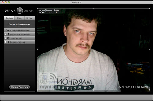 Periscope senses motion passing in front of your iSight, or any other camera that works on your Mac, and takes a picture. It sounds simple enough, and it is. But the power of Periscope is well hidden behind an easy to use interface.