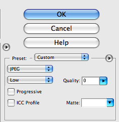 File > Save for Web > Presets for custom JPEG settings was defective in Elements 6 for Mac, and it continues to be broken in version 8. Adobe is aware of this problem, and blames Apple. This is unacceptable. When a serious company is aware of a serious problem for several years, it needs to get serious and fix it.