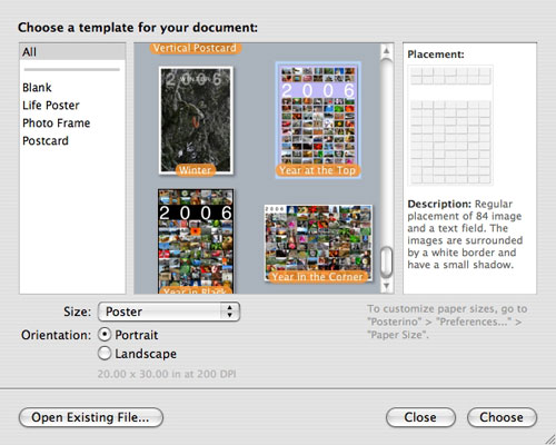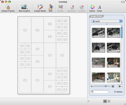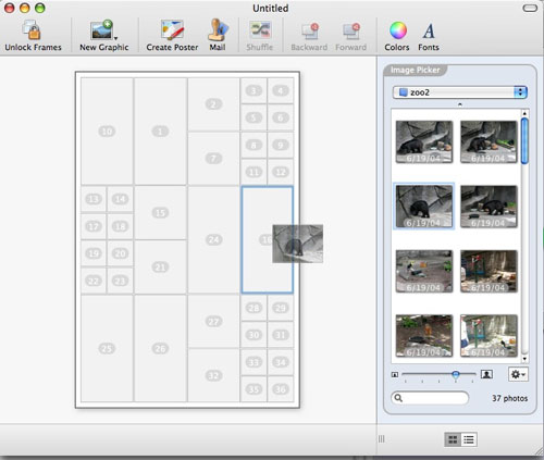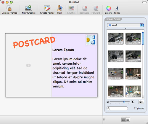 At first glance, Posterino looks like a Print Shop/Photoshop type of program, but it isn’t. Posterino is a program for making photo collages, photo postcards, and more. The projects you work on can be as simple or as complicated as you want. Plus, you don’t have to use only photos. If you can import the image file into iPhoto, you can use it in Posterino.