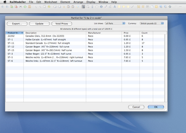 One annoyance is the separation of the Stock option under the File menu (where you edit the list of track pieces you have) from the Part-list option under the Worksheet menu (where you can see and export the list of track pieces you need). Contrary to most of the rest of the application, you probably will need to read the manual to realize that these two options are interconnected, and until you’ve edited the parts list via the Stock option, the Part-list option won’t be able to list the pieces of track you need to buy. This is really the only part of the application that is genuinely badly designed, and that’s perhaps why it stands out as being so boneheaded.