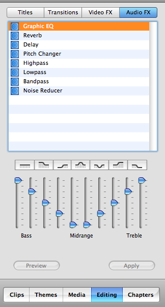 Okay, enough about navigation problems. I have to say I like a couple of the new editing features. First off, Audio FX is a welcome add-on to ’06. No, it’s not like Soundtrack or other similar audio editing programs, but the Noise Reducer, the Graphic EQ, and the Reverb make for some much needed clarity and boost to my current production. If you’re new to this type of audio editing, you have to experiment with the controls some and apply several different ones to the same clip to get the sound quality you desire. It also seems that if you extract the audio from its video clip, the Audio effect renders faster.