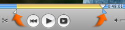 Performance: When I first started working in ’06 today, it stuttered, crashed, and produced the bouncing beach ball a number of times. So I quit out many of my other applications, repaired permissions, restarted iMovie a couple of different times, and it finally kicked in. I also discovered that when playing back edited video, iMovie seems to run more smoothly the less zoomed-in you are in the audio and video timeline viewer./