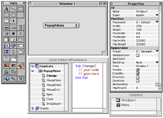 On launch, RB’s interface presents the user with a project window, a tools panel containing all the built-in control objects, the project’s main application window, and a properties palette. The project window allows you to manage all the windows, custom objects, pictures, etc. associated with a project. Double-clicking an object brings up a code-editing window to allow its modification. Double-clicking a window opens it, allowing visual editing of its controls. Controls are added simply by dragging them from the tools palette; they can be removed by selecting them and hitting the ‘delete’ key. Selecting a window or control brings up its attributes in the properties palette, letting you change its name, size, location, initial status, etc. Double-clicking a window or control brings up a code editing window identical to that used for objects.