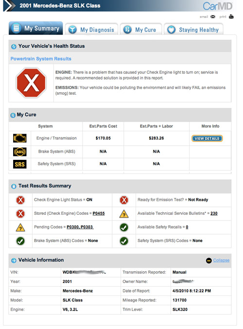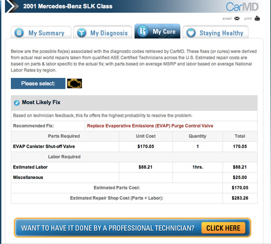 If there were problems, as in the case of the Mercedes, running a report will present you a summary report, as well as a cost estimate to repair. CarMD has a very large database of problem codes cross-referenced to a large number of repair shops, data they have been collecting for over 10 years now, and gives a fairly accurate summary of the costs to repair. This can be quite valuable if you take the car in for repair, as you will know if the estimate given is reasonable or not. The site also gives you a breakdown of parts needs as well by pressing the View Details, or going to the "My Cure" tab in the report.