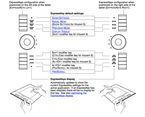 With the inclusion of two USB connectors, one may orient the ExpressKeys to the right or left depending upon preference. Next to the ExpressKeys, Wacom has included illuminated displays (OLED) which provide an instant reference as to the current function(s) for the corresponding key. This is a very nice and useful touch. In between both sets of ExpressKeys, Wacom has added a user-defined Touch Ring which can control up to four different functions within each application.