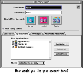 Once Multiple Users is set up, you can assign different privileges to different users. You can create normal, limited, or Panels accounts, each with its own set of restrictions which can easily be fine-tuned. You can limit such features as control panels, Apple Menu Items, the Chooser, and specific parts of your hard disk if you wish. You can also limit the specific applications and CD/DVDs the users are allowed to open.