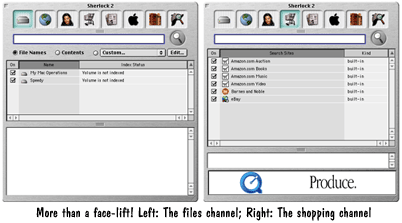 “Find File” and “Find by Content” have been combined into the “Files” channel, and separate Internet-related channels, such as “People,” “Shopping,” and “Sports” will allow Sherlock to custom tailor its content listing based upon what you’re searching for. So, for example, if you’re using the “People” channel, resulting columns will be “email address” and “phone number.” Searching in the “Shopping” channel will yield results appropriate to e-commerce sites such as Amazon.com, eBay, and others. You can still add plug-ins from various sites into the “Internet Search Sites” folder, but with the addition of channels they’ll be much less cluttered than before.
