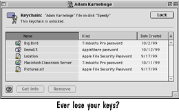 The Keychain Access control panel supports multiple keychains, and also supports certificates, which are special types of encrypted passwords for use with different types of Internet services. It’s important to note, however, that for the true power of the Keychain to be unlocked, applications will have to be updated, or “made aware,” of the Keychain before the passwords you store in them can also be stored in the Keychain. Fortunately, many applications are already Keychain aware as of this writing, including Timbuktu Pro from Netopia, and Apple’s own AppleShare client. Look for more applications to be made Keychain aware in the next few months.