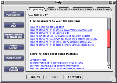 MacInTax looks different than last year’s “browser,” with a new design and several improved features. Users have instant access to Q&A sources, and the screen contains a dynamic-linked right column full of pertinent FAQ material which changes to correspond to every different screen being used by the intrepid taxpayer.