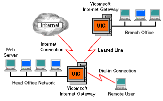 Internet Gateway has advanced options far and beyond the scenarios I described above. Internet Gateway comes with a built-in DHCP server, which makes client configuration for a large network very easy. It also comes with a WebCaching Server which stores and buffers web content automatically, thus improving performance and reducing the amount of precious bandwidth taken. Furthermore, it allows you to not only interconnect separate LANs (Local Area Networks) in the same building, but also WAN (Wide Area Networks) that could be anywhere in the world. An example of this is pictured below.