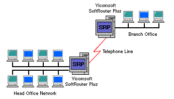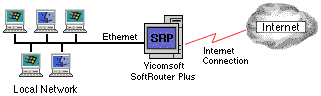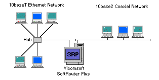 Vicomsoft Picture 3This type of interconnection could also occur between regular (10 Base-T) and fast (100 Base-T) Ethernet networks, or even between Ethernet and LocalTalk networks. Now, all the computers on both the networks use the same Internet connection courtesy of Soft Router Plus.
