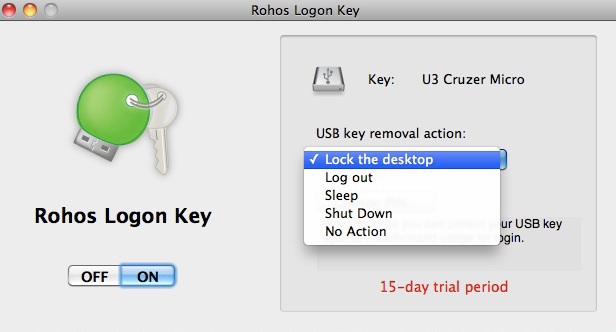 The Rohos Logon Key for Mac (the "Key" hereafter) is a USB flash drive-based security solution. The Key allows two-factor (two separate passwords) logins, as well as requiring the USB key for login. It also permits the user to force certain actions whenever the USB flash drive is removed.