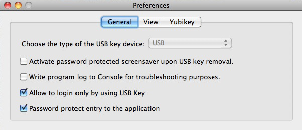 Other features are controlled by the Preferences window. More security can be obtained by choosing Allow to login only by using USB Key, and Activate password protected screensaver upon USB removal. "Allow to login only by using USB Key" mean just what it says. If this option is not enabled, someone can use automatic login (if enabled), but the Key will be required whenever the admin password is needed.