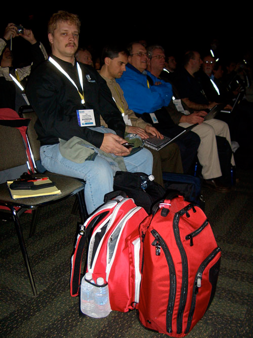 We test a lot of computer packs and cases at MyMac, and this is one of the best. I’ve used it on two demanding trips, with great success. During last January’s Macworld Expo, a red Skullcandy Audio Pack was my constant companion. It performed flawlessly. It’s the one on the left in the photo below.