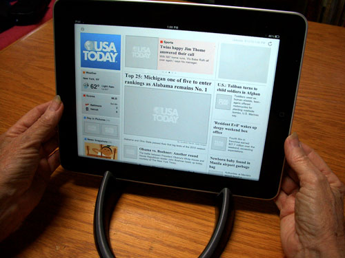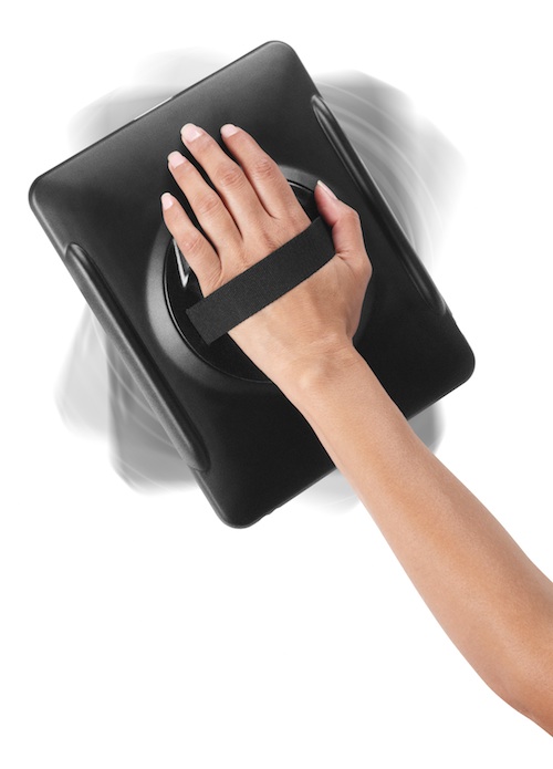 Bracketron’s Twist360 has four spring clips to securely grip the iPad (as well as many other tablets and e-readers). With the device attached, the iPad can be propped up on a table or other flat surface. The 4-inch ring on the back can be adjusted to a comfortable viewing angle. This ring also rotates so that the iPad can be viewed horizontally or vertically. It is encased in silicone so it doesn’t slide and it also serves as a comfortable carrying handle.