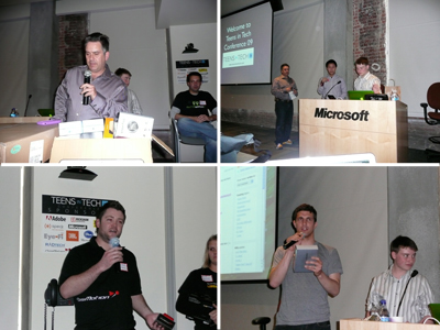 Ustream streamed much of the conference live; well, for as long as the sad Internet connection supplied my Microsoft kept them live. Sadly, Microsoft’s large room that easily held more than 100 people offered only a partial Class C address space of less than 55 IP addresses to all guests. As you can imagine, almost every participant had at least a computer and one other Internet device like an iPhone, so the available addresses were used up immediately, and the rest got nothing. (Microsoft says this will be fixed shortly!) However, it was amazing to see just how much technology these young people carried as the Internet cell cards and connections to cell phones started showing up to keep people on line. This was important, as the entire conference was also covered on Twitter, with questions and comments from the audience arriving by Twitter and displayed on the big screens rather than the more conventional raising of hands. You can see the tweets from the conference here and eventually they hope to have all the presentations up there as well. You can follow the continued action at #teensintechconf on Twitter. It should also be pointed out that about half way through the conference, the Twitter action on the conference was so busy, that the conference became the most talked about subject on Twitter, taking the number one spot away from the Super Bowl!