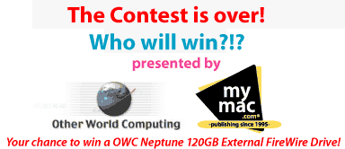 Participants are asked to create a song no longer than 3:00 minutes, and then email your song to garageband-contest@mymac.com. The winner will be chosen before February 28th, 2004, and will receive courtesy of Other World Computing an OWC Neptune 120GB external Firewire 400 hard drive.