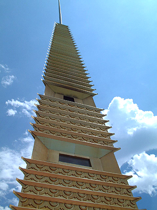 Architect Frank Lloyd designed the massive, strange Marin County Civic Center in San Rafael, late in his career. Steps take visitors up to a gallery deck with splendid views of the building and surrounding communities. Rising from one corner is this semi-Oriental tower, which can be seen for miles in every direction.