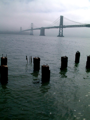 What will I remember about the Bay Area? From downtown San Francisco the Bay Bridge to Oakland and beyond looms massive and loud overhead and into the distance. Weather changes constantly, from bright and sunny to moody and foggy, then to something unexpected. CaliPhoto#2 featured the famous Golden Gate Bridge, so let’s give a farewell glance to its solid sibling, seen here from the Embarcadero near Ferry Plaza.