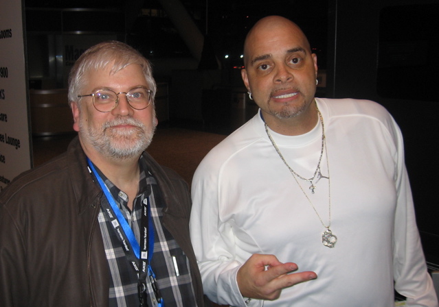 That wasn’t the end of my star-studded day! As the three of us walked up the stairs to head over to the Podcaster’s event at Jillian’s, in the main lobby, it was none other than famed comedian Sinbad, who was holding court with a small group of people. Tim and Bill were able to wangle an interview with him which will appear on this site sometime soon. I even got my picture taken with him. A really nice guy, who has been a Mac devotee for many years. He loves technology, and makes the best use of it that he can for himself, and his family.