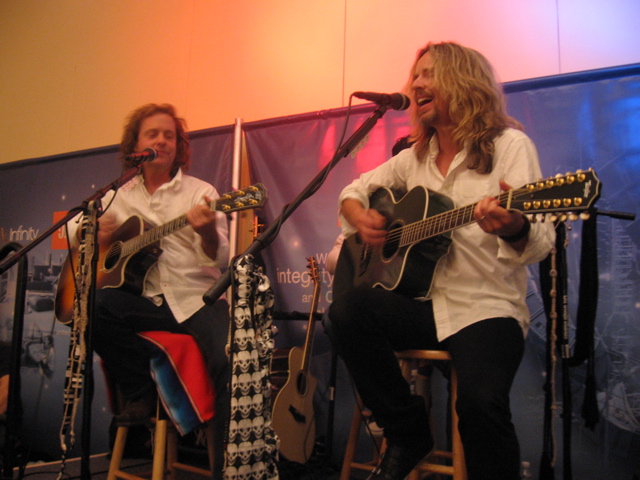 After all this fun, I returned to the media room in the south hall, where I was asked by MyMac.com writer and iProng owner Bill Palmer to use my camera for a big event. The rock band Shaw-Blades was playing in the JBL/AKG room, and Bill had an opportunity to get pictures of them next to the Apple display on the convention show floor. I accompanied Bill and got a chance to meet Tommy Shaw and Jack Blades. I could not remember Tommy’s last name to save my soul, and at one point, while waiting out in the hall with Bill, I said something like…yeah, Tommy somethingorother. A young lady from Creative Pro with video camera and lots of colorful tattoos on her arms got very animated and shouted “Tommy SOMETHING? Tommy SOMETHING? That’s Tommy SHAW!” I apologized profusely and told her I was a old school jazz guy and really didn’t know any of today’s rock players. When I met the band, I got a change to say a few words to Tommy (Shaw). Tommy obviously did not remember that I had met him about 12 years before, waiting in line at the Iridium bar, to talk to guitar legend Les Paul. We went downstairs and did the photo shoot–very professional and very well-done. I was impressed at how Shaw and Blades were “handled” and how quickly things came together.