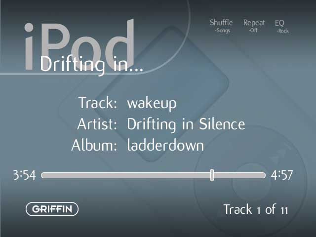 The time display only shows how long a track has played, not how much time is remaining. There is no album art shown. Griffin’s support page explains that this is because album art is not transmitted through the dock connector.