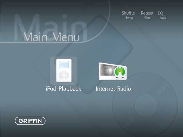 The settings button gives you access to familiar iPod controls like shuffle, repeat, and equalizer. The equalizer will not work with newer iPods that have been updated to the latest iPod firmware via iTunes 7. This was the case for me. Griffin has informed me that this is a known bug, and they are working on a firmware update.