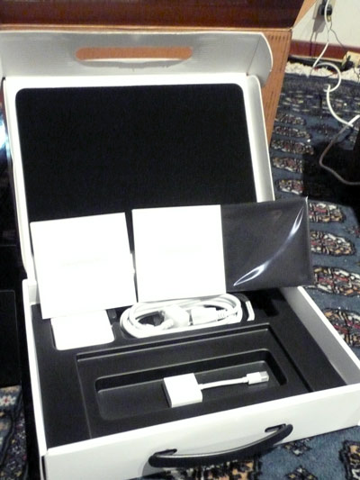 You lift out the computer “tray†and underneath are the power supply, power cord, a black envelope that contains three items: A small white booklet labeled “Everything Macâ€, a small white booklet labeled “Everything Else†(which contained the install and applications DVDs, and a small black cleaning cloth, which has a small black apple printed on the corner. Underneath this black envelope was the DVI monitor adapter I paid extra for.