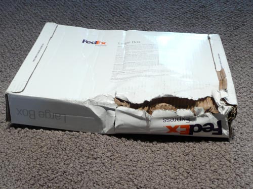 This box, on the other hand, was left at my front door, while I was home today by FedEx with no door bell ring and looks like it was used to play hockey at the Fed Ex office before it got here. The box was slightly damp (it is raining here) but was left at my front door, which is covered. Exactly where was this left out in the rain?