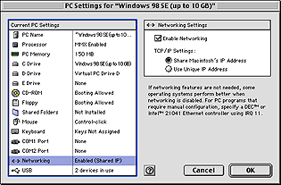 Connecting to the net while dialed in with my built-in modem on both the iMac and G4 was also no problem. In fact, if I had a network connection, Windows under VPC found and used it very well.