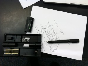 So what exactly is this Inkling thing that I am raving about and haven’t even described yet? Simply put it is a device by Wacom (the company known for drawing tablets) which allows you to draw on a regular piece of paper with a ball point pen and have that image digitized. That image can then be converted to a vector image for Illustrator or it can be converted into a Photoshop file. (It can also be sent to Sketchbook Pro). Instead of exporting to one of these programs you can also export in JPG, BMP, TIFF, PNG, SVG or PDF for use in the software of your choice. As I said, it works as advertised and is fantastic.